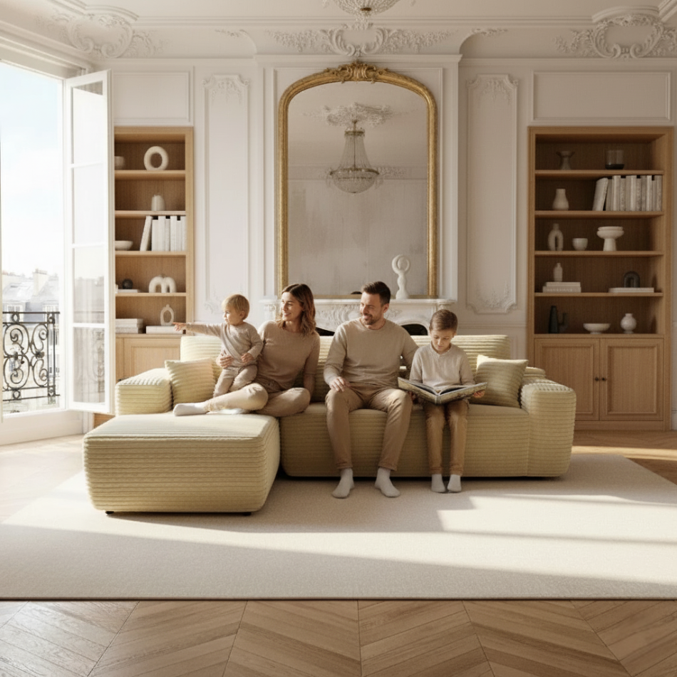 Le Kanap Family est conçu à partir de tissus hautement résistants à l’usure et aux taches, sélectionnés pour leur douceur et leur durabilité exceptionnelle. Son revêtement conserve son aspect élégant et son confort, même après plusieurs années d’utilisation quotidienne.